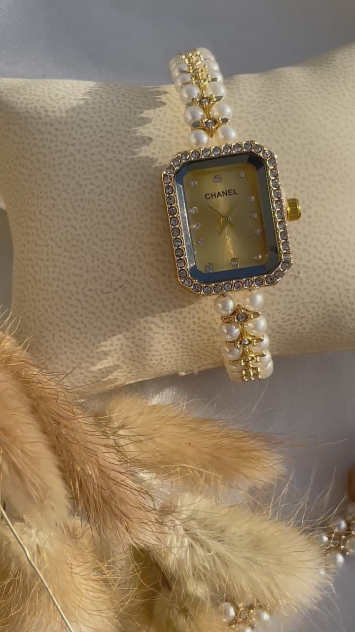 Son bracelet à double rang de perles, doux et féminin, enlace le poignet avec une grâce naturelle. Le boîtier doré, quant à lui, reflète la chaleur de l’or et l’éclat des strass, créant une harmonie parfaite entre élégance et éclat.