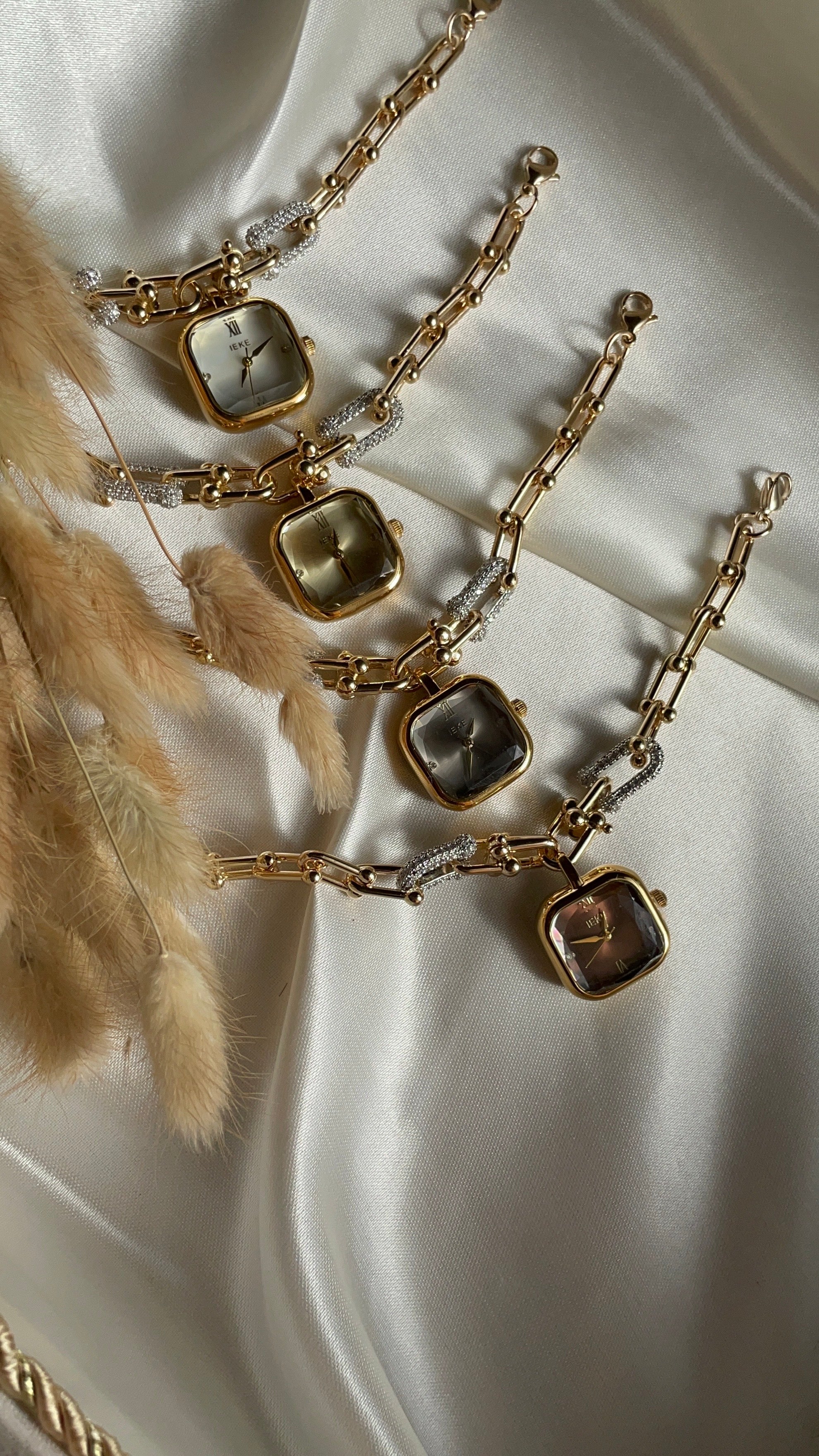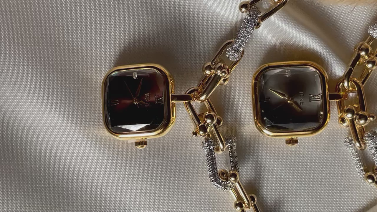Laissez-vous envoûter par cette collection où le cadran semble flotter dans son écrin doré, comme en apesanteur. Les détails en strass captent la lumière, tandis que le bracelet aux maillons sculptés enlace le poignet avec raffinement.